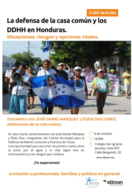 Queridas familias, profesorado y comunidad educativa: Desde la Comisión de Solidaridad de la APYMA os animamos a participar en el Café tertulia organizado por ALBOAN: “La defensa de la casa común y los DDHH en Honduras. Situaciones, riesgos y opciones vitales” 8 de octubre 18:00 h Colegio San Ignacio, Jesuitas. Aula RTC (Calle Bergamín, 32) Será un encuentro con José Daniel Márquez y Élida Díaz Lemuz, defensores de la naturaleza e integrantes del Comité Municipal para la Defensa de